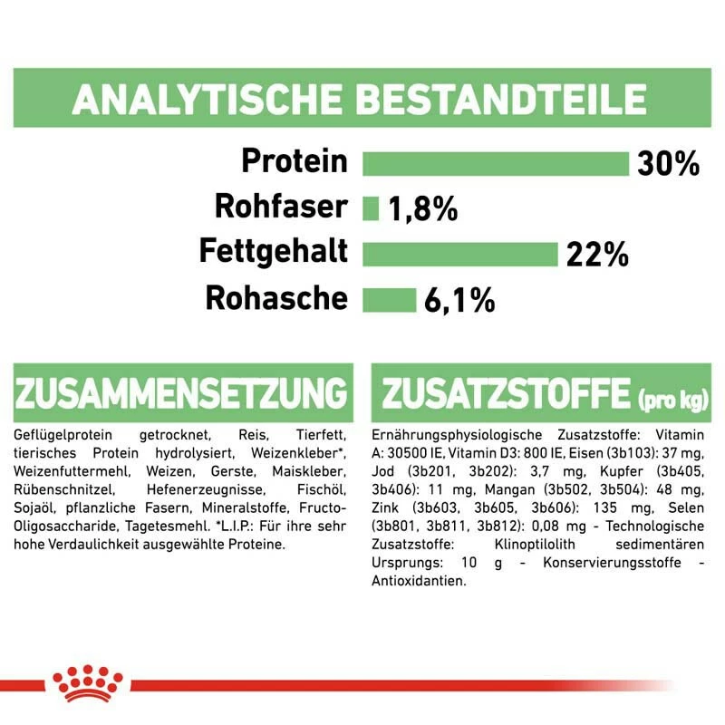 Für Royal Canin sind Proteine sehr wichtig. Wir verwenden ausschließlich die hochwertigsten Proteine und passen die Proteinquellen an die exakten Bedürfnisse Ihres Hundes an. Deswegen beinhaltet die Rezeptur von ROYAL CANIN Digestive Care Mini sehr hoch verdauliche Proteine (sogenannte L.I.Ps).